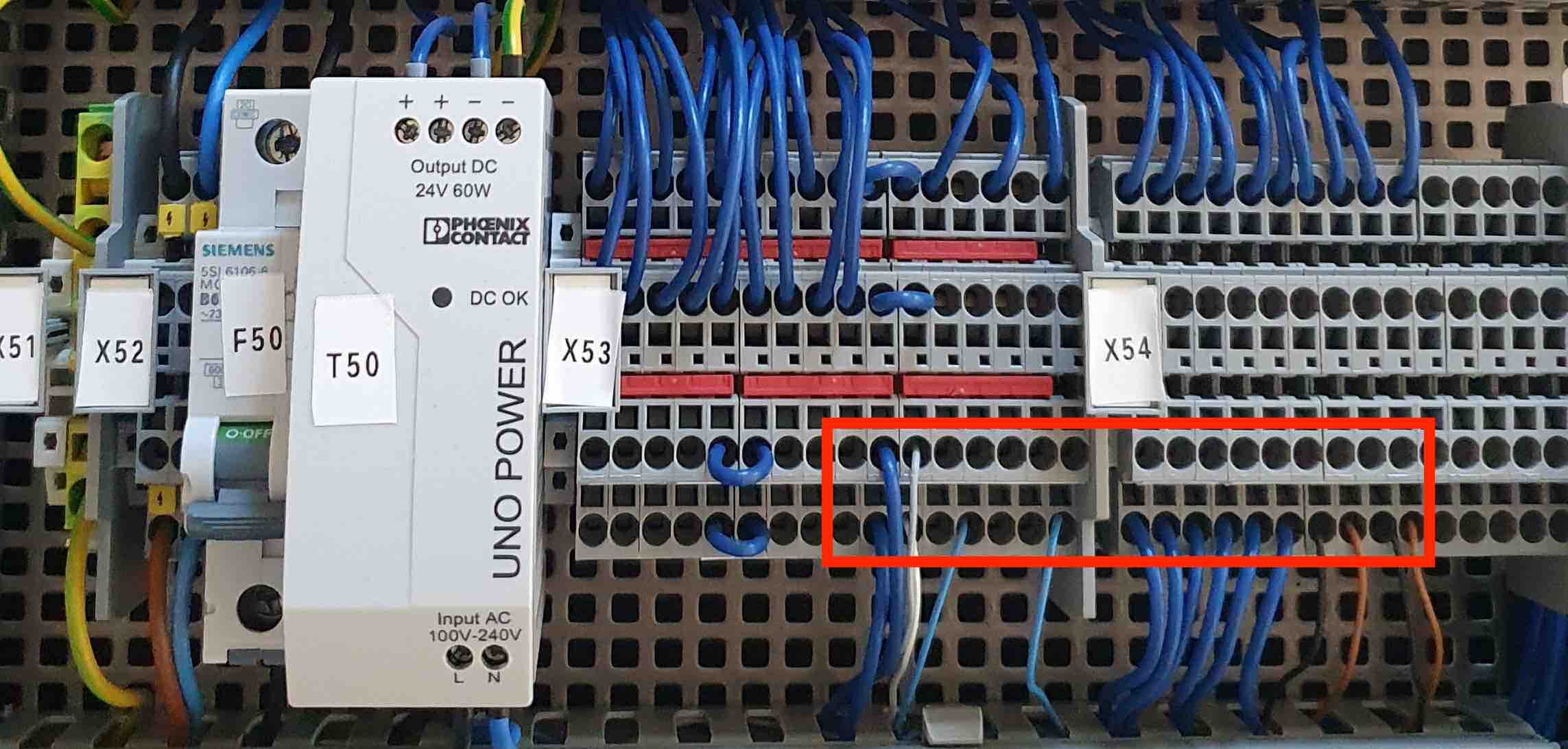 Mithilfe der letzten Aufgaben sollte es nun kein Problem sein, das externe Bedienfeld korrekt an die Klemmenleiste anzuschließen, da die Farbcodes aus dem Schaltplan erarbeitet wurden.