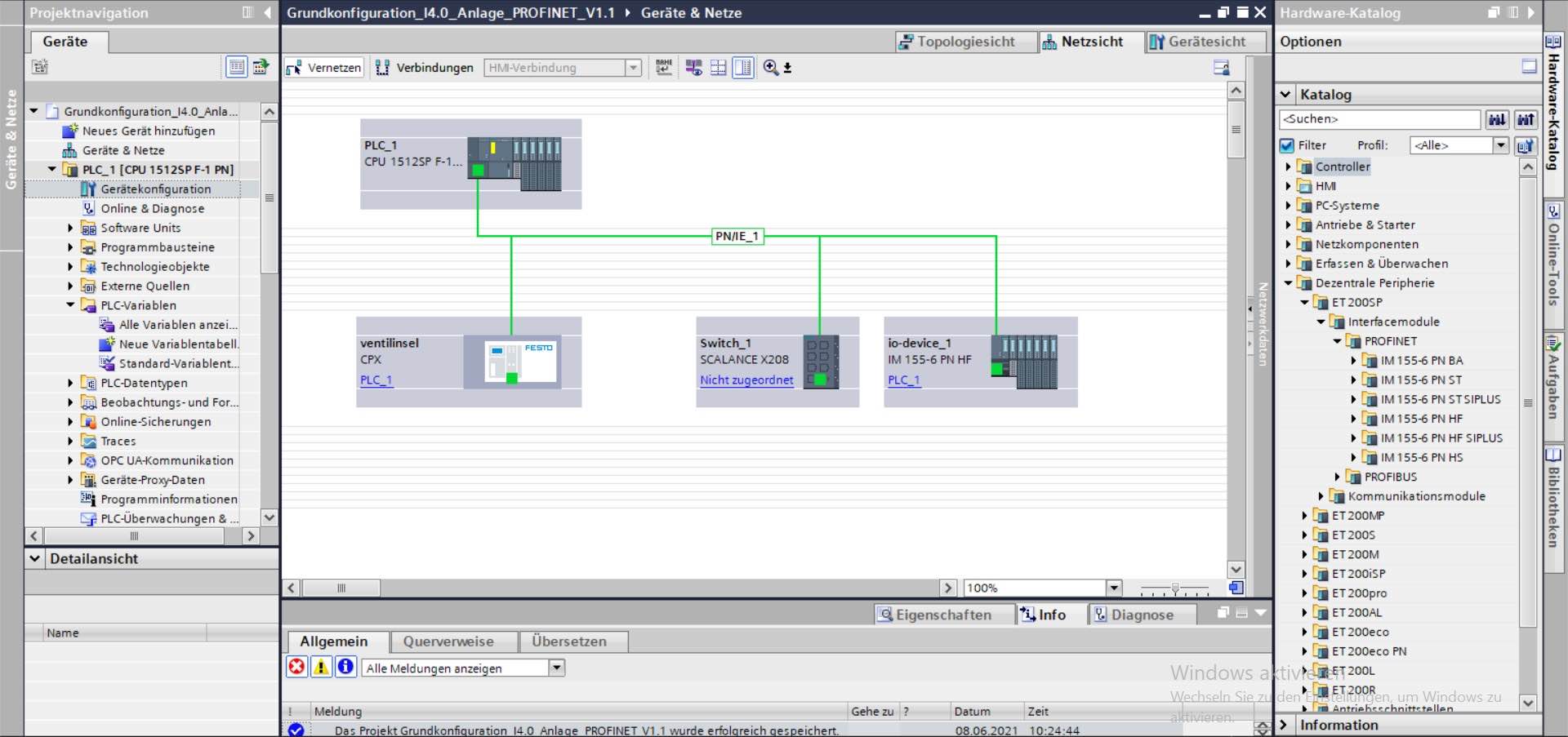 Über den Ordner "PLC_1 [CPU 1512SP F-1 PN]" lässt sich auf die Gerätekonfiguration zugreifen und zunächst die CPU mit ihren Ein- und Ausgabemodulen anzeigen. Wählen Sie nun oben rechts die Netzsicht aus, sodass sich folgende Ansicht ergibt: