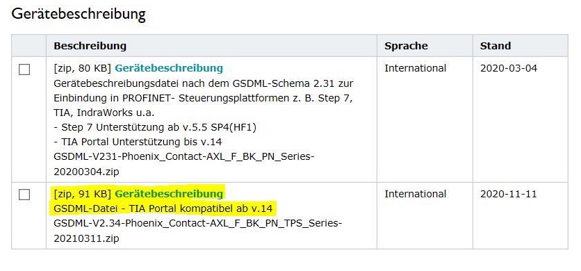 Für das Phoenix Contact Modul ist dies nicht direkt möglich, da es die Hardware eines fremden Herstellers ist und zunächst eine Gerätebeschreibungsdatei in das Projekt eingefügt werden muss. Diese ist auf der Herstellerseite unter Downloads herunterzuladen: