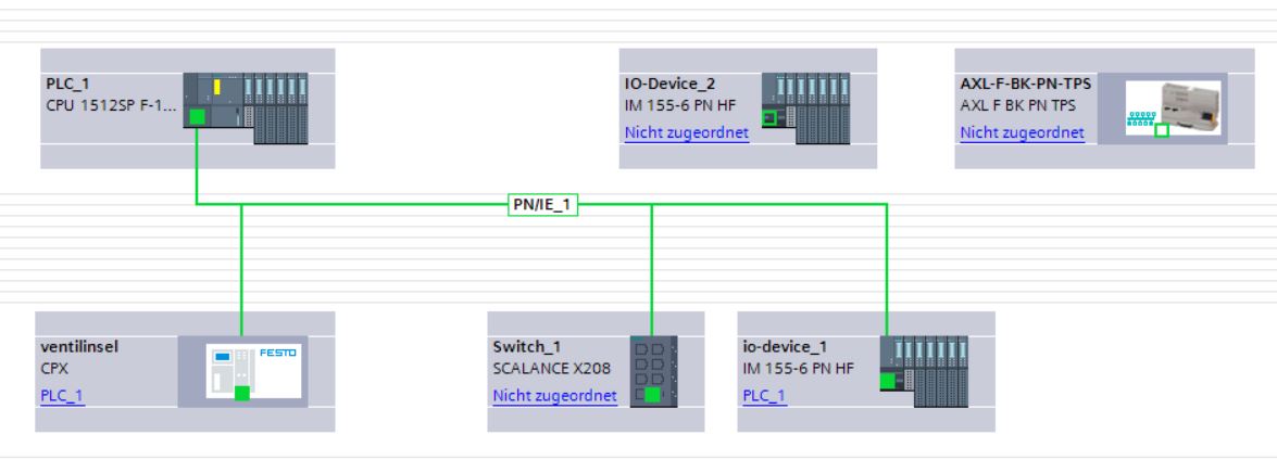 Es ergibt sich im Anschluss folgende Netzsicht, bei der die beiden IO-Devices dem Master (PLC_1) noch nicht zugeordnet sind.
