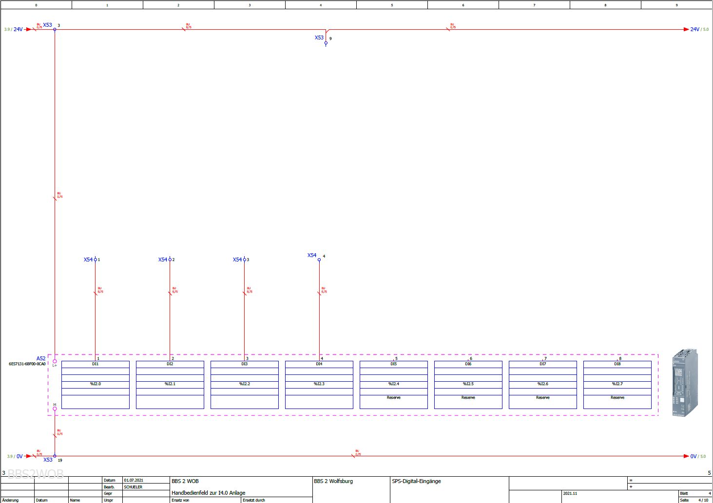 Nun geht es zum etwas schwierigeren Teil über, in dem der bestehende Schaltplan um die Taster und Leuchtmelder des externen Bedienfeldes erweitert wird. Auf der Seite 4 fehlen die vier Taster (Öffner/Schließer, auf Drahtbruchsicherheit achten!) an den Eingängen des ET 200SP Moduls und auf Seite 5 die entsprechenden Leuchtmelder, die später so angesteuert werden sollen durch das SPS-Programm, dass sie den jeweiligen Betriebszustand der Anlage anzeigen.