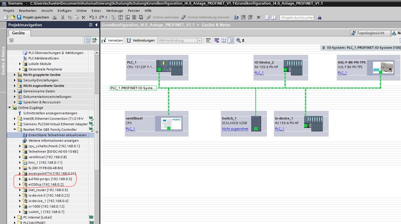 Bevor nun fortgefahren wird, muss das PROFINET Board an die Industrie 4.0 Anlage mit einer Ethernet Leitung angeschlossen werden, am besten am unterstem Ethernet Steckplatz des Anlagennetzes. An dem Switch ist ebenso der PC, auf dem die Programmierung in TIA Portal stattfindet, angebunden. Das ET 200SP Modul ist auf dem Board bereits mit dem Phoenix Contact Modul verbunden, sodass die PROFINET Leitung direkt an das Siemens Modul, bzw. einen freien Steckplatz angeschlossen werden kann.