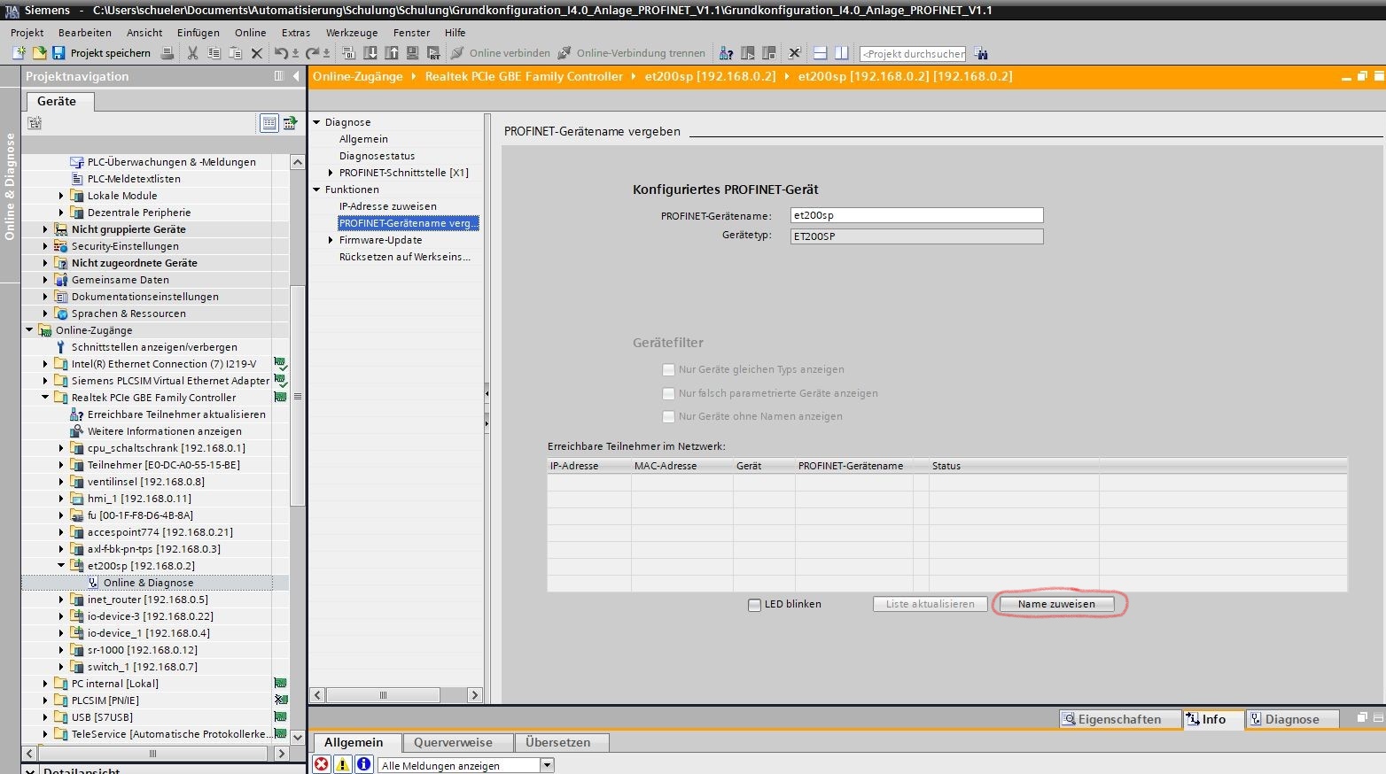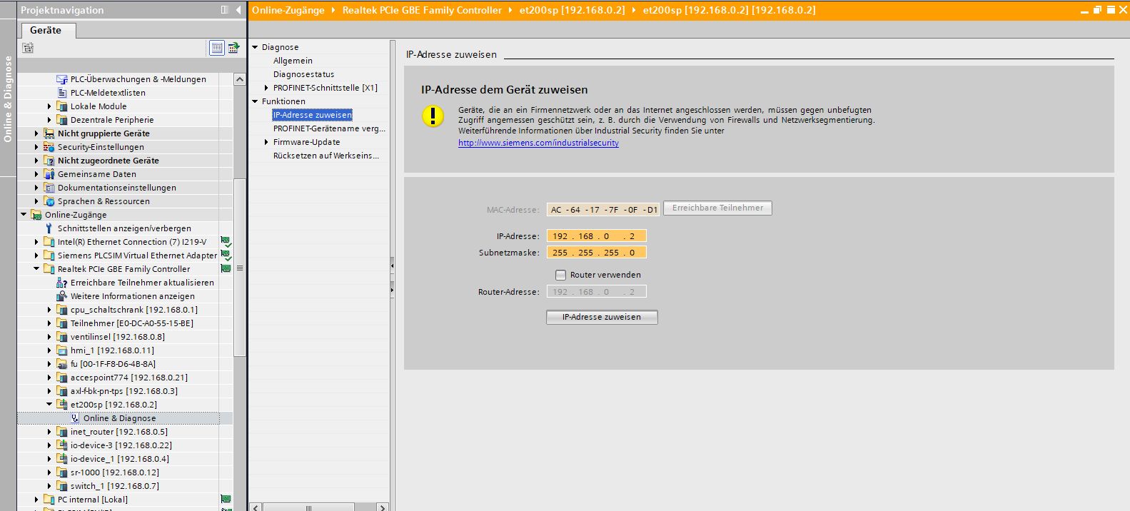 Sollte den realen Modulen keine IP-Adresse zugewiesen sein oder Gerätename oder IP-Adresse nicht mit denen des Screenshots übereinstimmen, lässt sich dies über den Ordner des jeweiligen Moduls in "Online & Diagnose" anpassen. Auch, wenn eine Buchstaben- und Zahlenfolge zu sehen ist, müssen Sie die IP anpassen, da es sich in dem Fall um die MAC-Adresse des Geräts handelt und keine IP vergeben ist. Unter Funktionen lässt sich der PROFINET Gerätename ändern, wobei darauf geachtet werden muss, dass dies unter "Name zuweisen" auch bestätigt wird. Es empfiehlt sich zuvor mit der Funktion "LED blinken" zu prüfen, ob es sich auch um das richtige Modul handelt, dessen Name geändert werden soll.