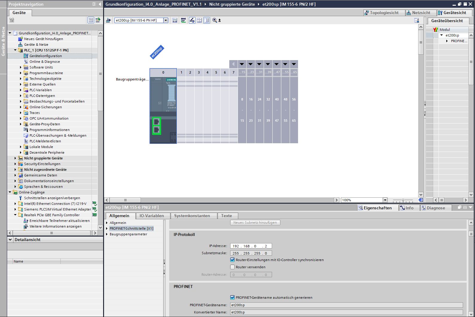 Es empfiehlt sich, die Namen der realen Geräte und deren IP-Adressen zu notieren, bzw. in der Projektsicht die Online-Zugänge offen zu lassen, um diese dann auch korrekt in der Gerätesicht bei der Konfiguration der IO-Devices zu übernehmen. In die Gerätesicht der einzelnen Module gelangt man entweder über einen Doppelklick auf das jeweilige Modul aus der Netzsicht heraus oder über den Reiter "Gerätesicht" und die Auswahl des Geräts aus der Leiste oben links. Die automatisch erstellten Namen der PROFINET-Module müssen nun geändert werden.