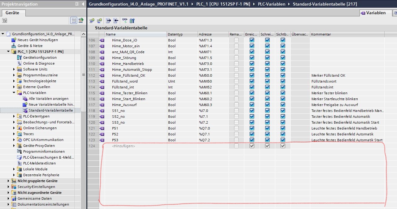 Da nun die digitalen Ein- und Ausgabeadressen auf Byte 7 gelegt wurden für das Phoenix Contact Modul, bzw. auf Byte 2 für das ET 200SP Modul von Siemens, muss dies auch in der Variablentabelle des SPS-Programms berücksichtigt werden.
