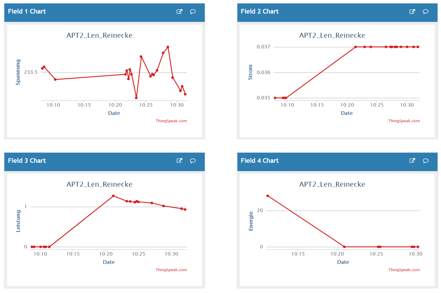 Hier sind die aufgenommenen Messdaten über der Zeit zu in Thingspeak sehen.