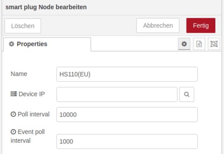 Folgend wird auf das Modul node-red-contrib-tplink-iot eingegangen. Die notwendige Node "smart plug" kann unter dem Reiter "devices" gefunden werden. Die folgende Abbildung zeigt die Konfiguration der smarten Steckdose. Unter der "Device IP" muss dann die IP-Adresse der Steckdose im Netzwerk angegeben werden. Diese kann in den Einstellungen des jeweiligen Routers ermittelt werden. Dabei sollte darauf geachtet werden, dass der WLAN-Steckdose eine permanent gültige IP-Adresse gegeben wird. Dadurch wird eine permanente Adressierung und Funktion gewährleistet.