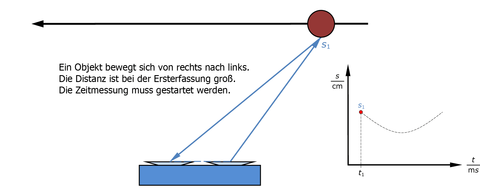 Bei der ersten Erfassung des Objektes (s1) muss eine Dauerdistanzmessung eingeleitet und zu diesem Zeitpunkt (t1) ein Timer für die Zeitmessung gestartet werden. Dieser wird gestoppt, wenn eine zweite Distanz gemessen wird, die gleich oder größer als die Anfangsdistanz s1 ist. Dies ist bei der Distanz s7 zum Zeitpunkt t2 der Fall. Da die Bewegung gleichförmig erfolgen soll, wird während jeder Distanzmessung die gleiche Strecke zurückgelegt.