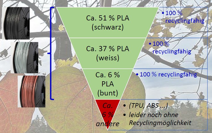 Da die überschüssigen PLA-Reste, anstatt auf dem Müll zu gelangen recycelt werden, wird die Abfallproduktion sinken und es gelangt signifikant weniger Plastik von uns in die Müllverbrennung (die Grafik zeigt die Anteile der verwendeten Filamentwerkstoffe, alles aus PLA ist zu 100 % recyclingfähig).