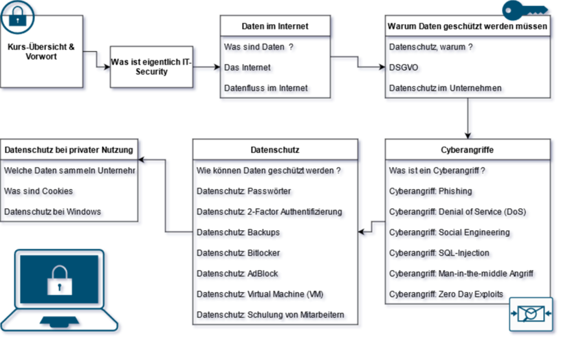 Hallo Kursteilnehmer/in dieser Kurs soll dich in die Basics der IT Security einführen, neben den häufigsten Cyberattacken, lernst du kennen warum Daten geschützt werden müssen.