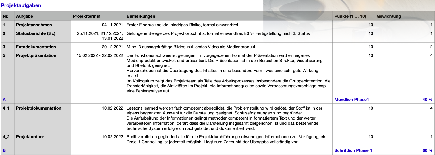 Die Beurteilung der Kompetenzentwicklung durch die gesamte Projektdokumentation und Präsentation berücksichtigt die Vorgaben der FST. Zum Bereich A (Mündlich) werden neben den Abgaben gemäß der einzelnen Projektaufgaben stets Projektteambesprechungen bzw. ein Kolloquium nach der Präsentation geführt. Zum Bereich B (schriftlich) werden Kriterien für die Bewertung aufgestellt, die in den Bemerkungen (siehe Abbildung) wiederkehren.
