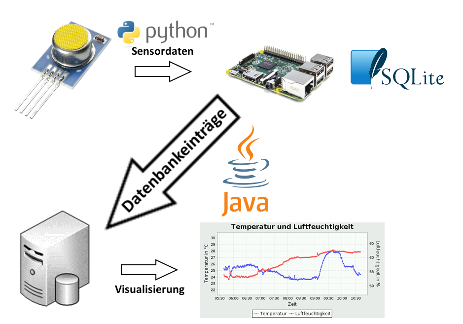 In einer Produktionshalle soll die Temperatur und Luftfeuchtigkeit überwacht und aufgezeichnet werden. Zur Temperaturmessung ist ein Einplatinencomputer (Raspberry Pi) mit dem Temperatur- und Luftfeuchtigkeitssensor HYT 221 vorgesehen. Weiterhin wird der Temperatur- und Luftfeuchtigkeitsverlauf aufgezeichnet. Zur Realisierung soll eine lokale Datenbank auf dem Raspberry Pi aufgebaut werden.