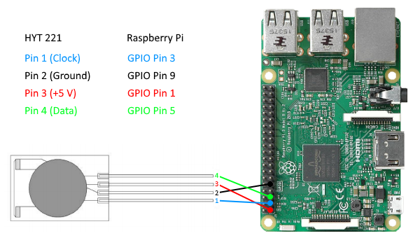 Der Raspberry Pi arbeitet mit 3,3 V Spannung, daher muss der Sensor dementsprechend ausgewählt werden. Der hier verwendete Sensor HYT221 kann in einem Spannungsbereich von 2,7 V bis 5,5 V arbeiten. Außerdem arbeitet der Sensor mit dem I²C-Protokoll, welches die digitalen Signale über zwei Leitungen überträgt: dem Clock-Signal (Taktsignal bzw. SCL-Pin) und dem eigentlichen Daten-Signal (SDA-Pin).