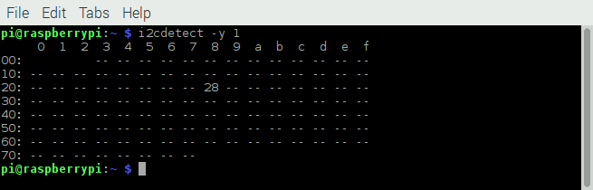 Lässt sich der HYT 221, wie in Bild 4, als Adresse 28 auffinden, so kann man nun das Python-Programm für das Auslesen des Sensors vorbereiten.