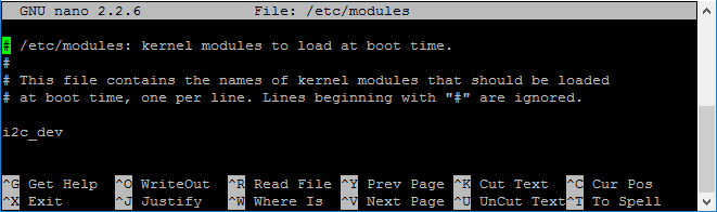 Um als normaler User des Raspberry Zugriff auf die I²C-Funktionen zu erhalten, wird sudo usermod -aG i2c pi in das Terminal eingegeben. In der /etc/modules-Datei muss ein neuer Eintrag hinzugefügt werden. Dazu wird die Datei im Terminal mit sudo nano /etc/modules aufgerufen. Dort soll nun eine Zeile mit i2c-dev hinzugefügt werden. Unter Umständen ist diese Zeile bereits vorhanden, dann muss die Datei nicht weiter bearbeitet werden.