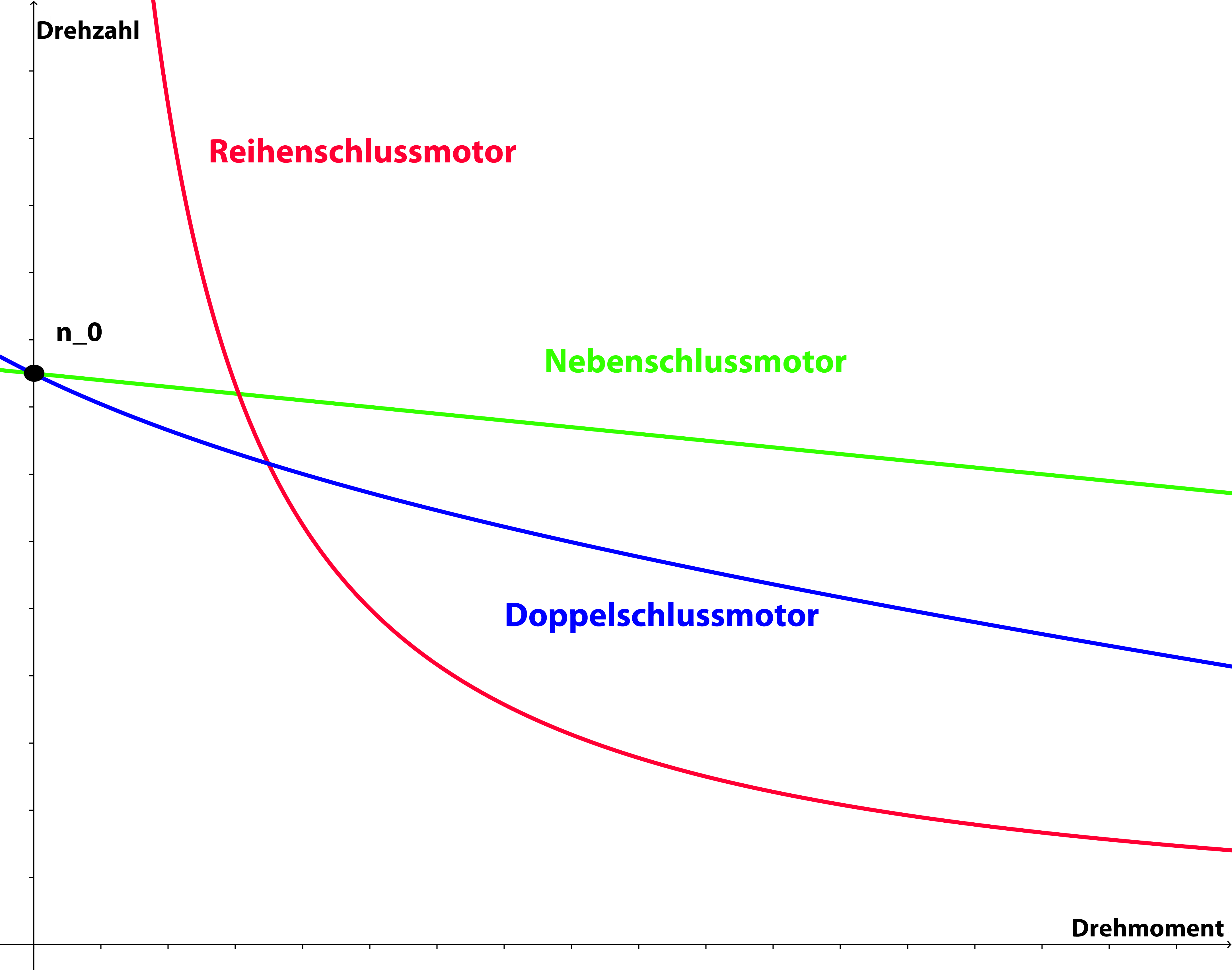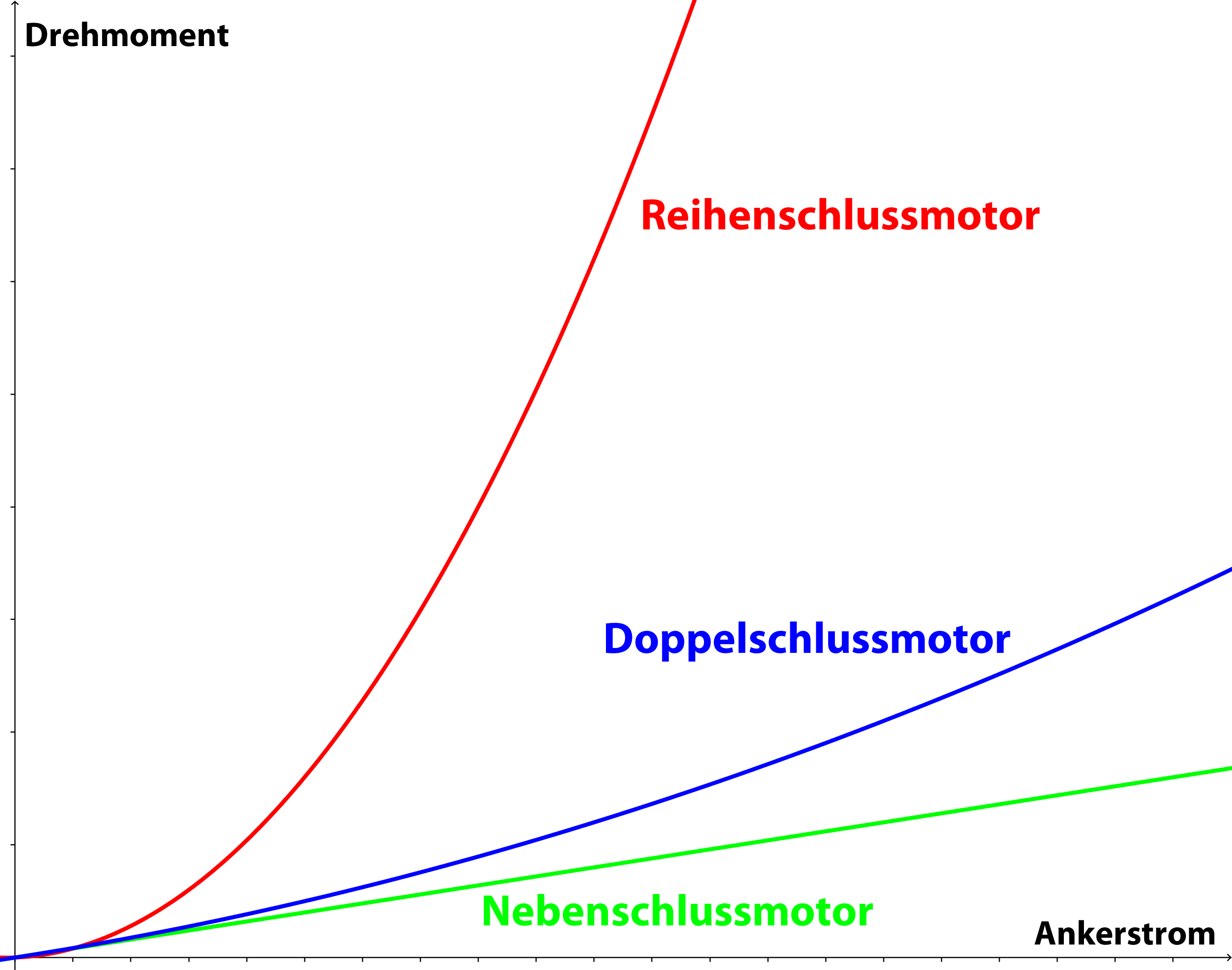 Das Diagramm zeigt den Zusammenhang zwischen Drehmoment und Drehzahl. Die Kennlinie des Doppelschlussmotors liegt zwischen den Linien der beiden anderen Motoren.