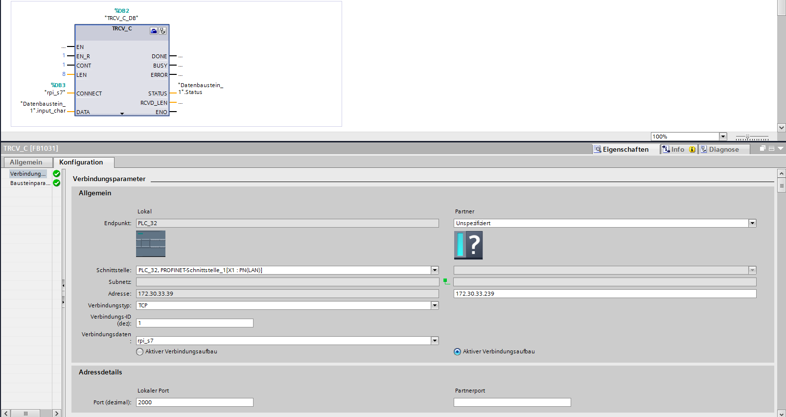 Im SPS-Programm muss nun die Hardwarekonfiguration an die zu verwendende Steuerungseinheit angepasst werden. Weiterhin muss in dem Kommunikationsbaustein, die IP-Adresse des Raspberry Pis hinterlegt werden. (siehe Bild 1)